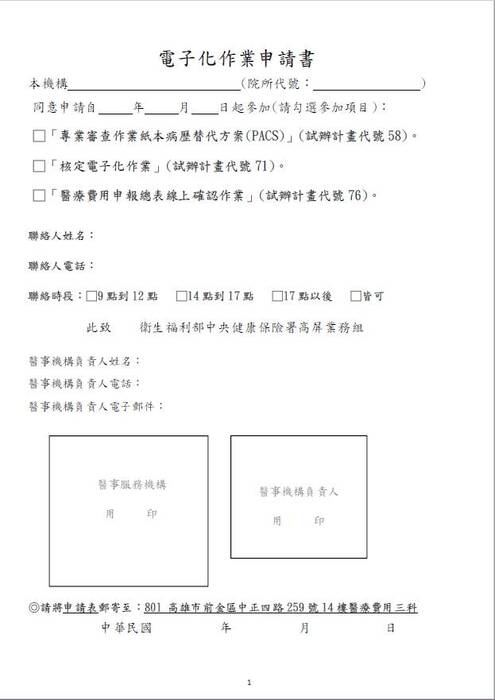 鼓勵院所參考電子病歷申報流程,申請書如附件,如有疑問請洽「健保局醫療費用三科231-5151」。